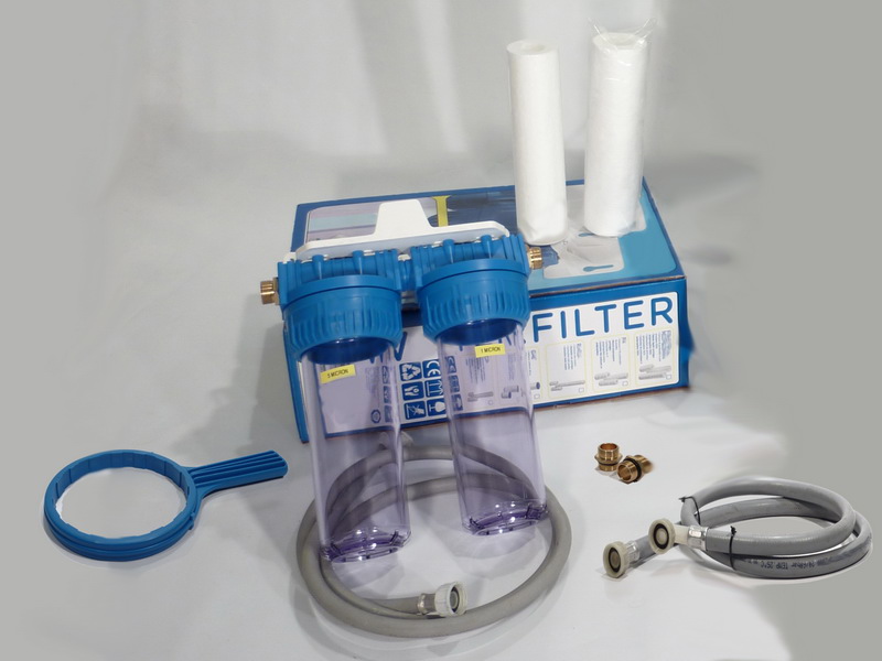Inhalt: 1 Stück Doppelfiltergehäuse (Art.nr. ec500005), 1 Stück Filtereinsatz 1-Micron-Maschenweite (Art.nr. ec509001), 1 Stück Filtereinsatz 5-Micron-Maschenweite (Art.nr. ec509005), 1 Stück Filter-Schlüssel (Art.nr. ec505090F), 2 Stück Messing-Doppel 3/3″ Außengewinde mit O-Ring-Dichtung (Art.nr ec508013), 2 Stück flexibler Waschmaschinen-Schlauch 3/4″ Innengewinde mit Dichtung (Art.nr. ec508008).